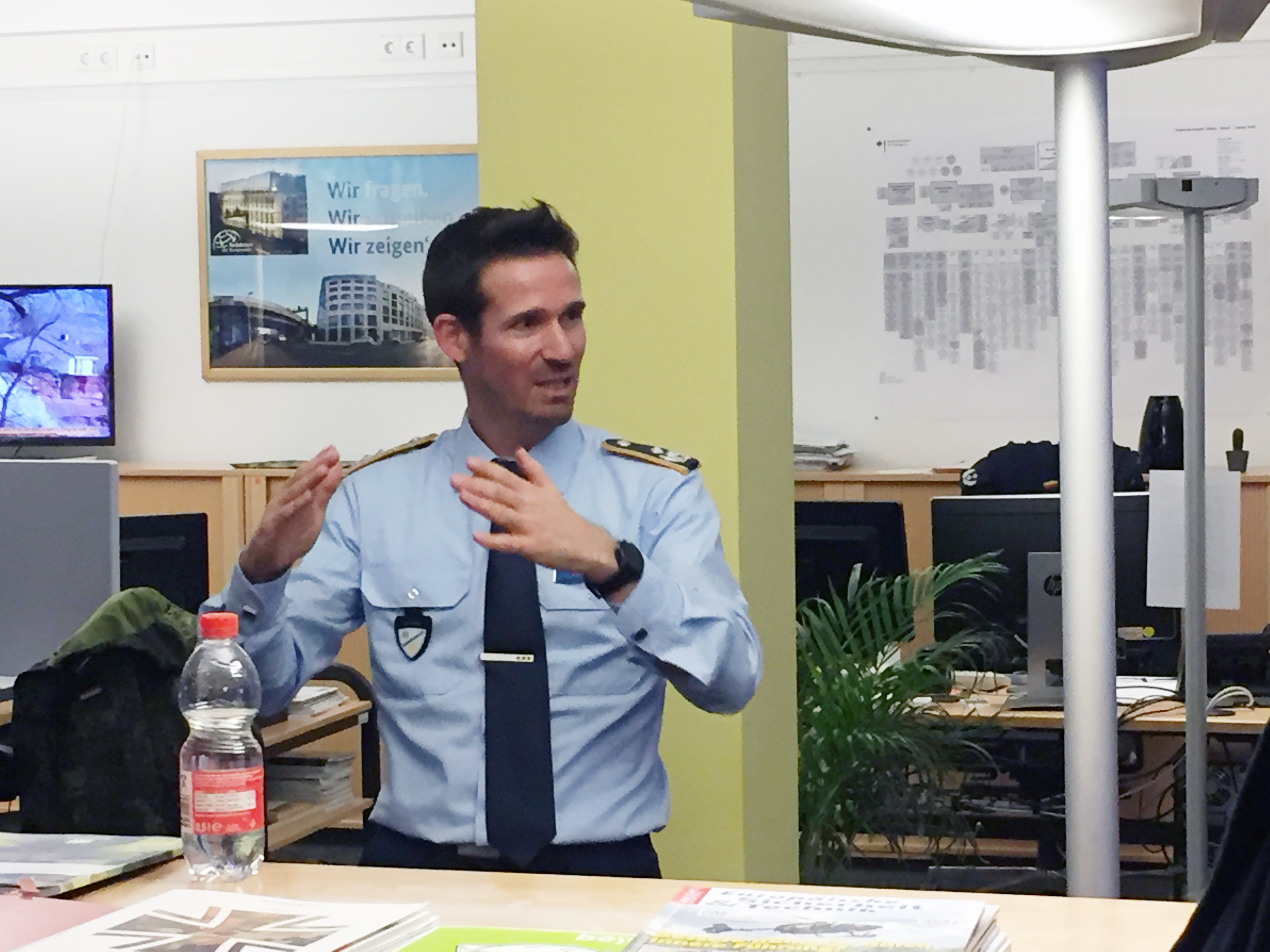 Unser Treffpunkt ist heute in Berlin Mitte. Oberstleutnant Stefan Kamp, hat uns in die Redaktion der Bundeswehr eingeladen, er ist hier der Chef vom Dienst. Wir stehen um den Tresen im Newsroom und hören zu, wie er über seine Arbeit berichtet. Es werden Fragen gestellt, häufig mit einem Zusatz wie „oder ist das geheim?“.